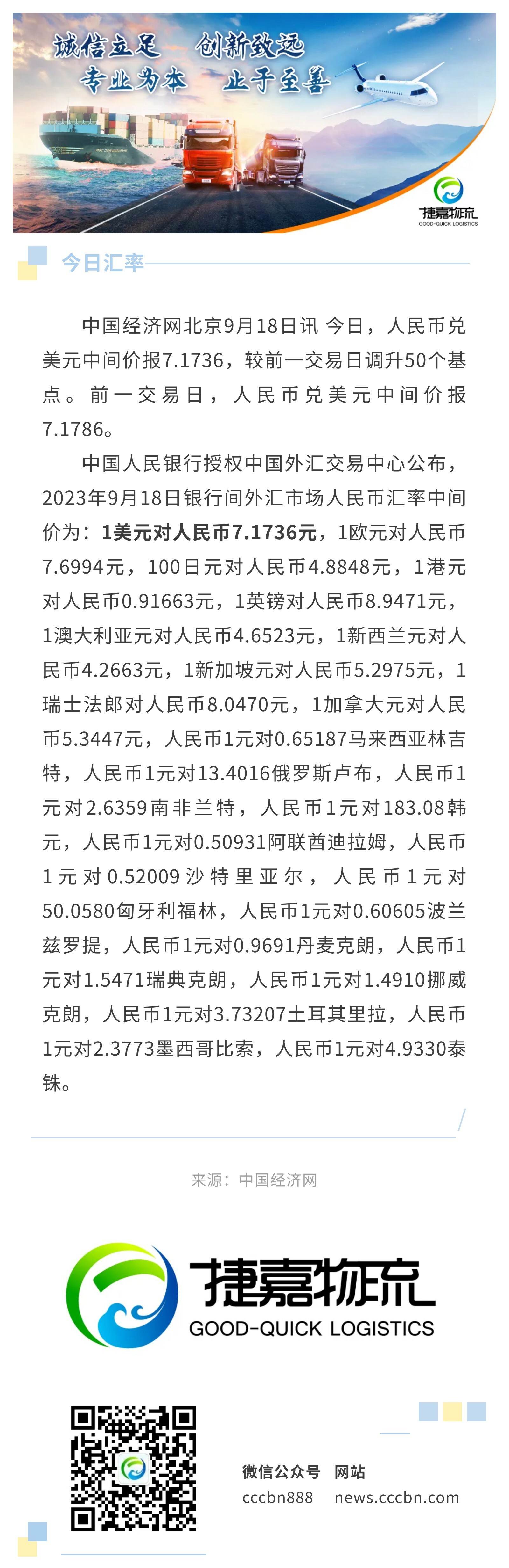 9月18日人民币兑美元中间价报7.1736,调升50个基点