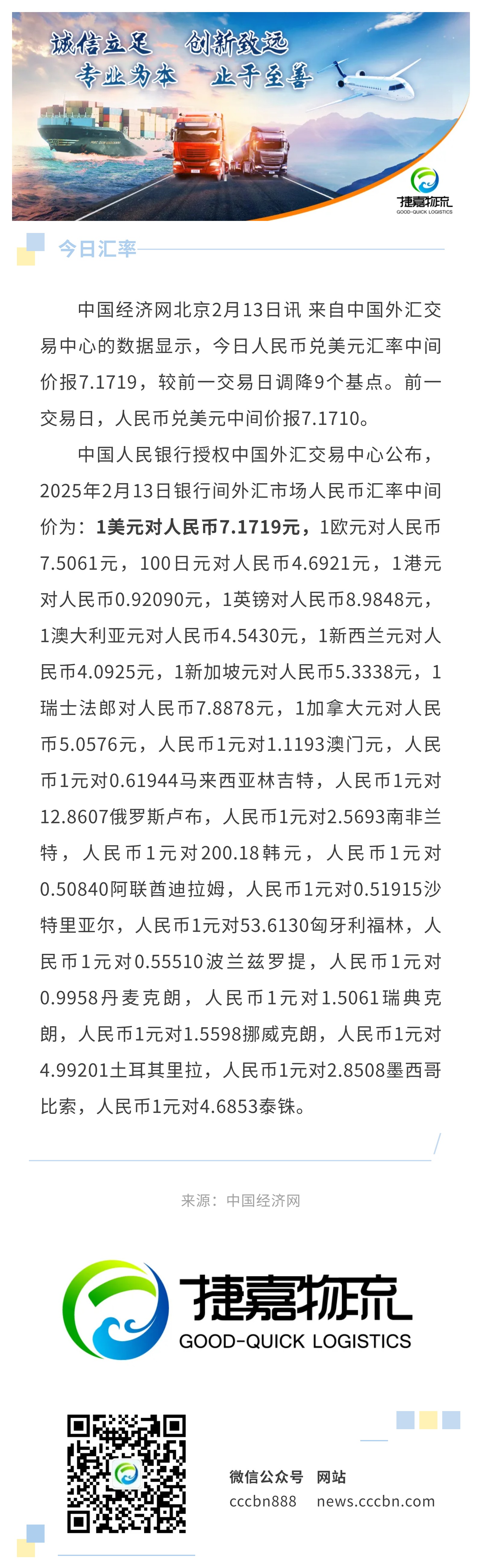 2月13日人民币兑美元中间价报7.1719,调贬9个基点
