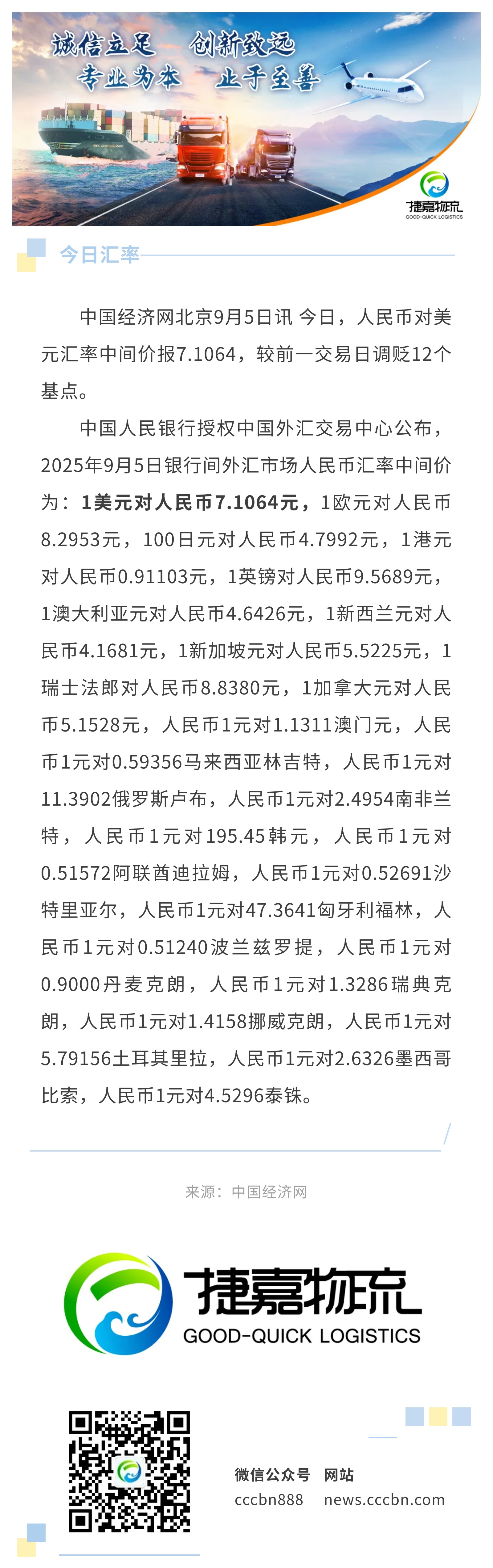 9月5日人民币兑美元中间价报7.1064,调贬12个基点