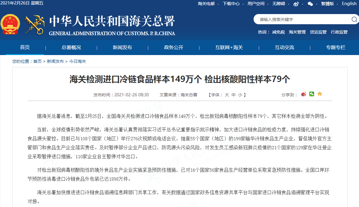 据海关总署消息,截至2月25日,全国海关共检测进口冷链食品样本149万个,检出新冠病毒核酸阳性样本79个,其它样本检测全部为阴性。
