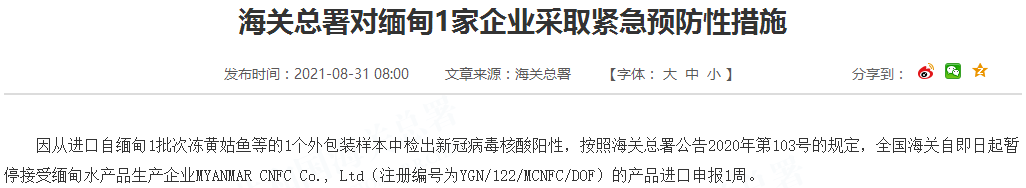 因从进口自缅甸1批次冻黄姑鱼等的1个外包装样本中检出新冠病毒核酸阳性,按照海关总署公告2020年第103号的规定,全国海关自即日起暂停接受缅甸水产品生产企业MYANMAR CNFC Co., Ltd(注册编号为YGN/122/MCNFC/DOF)的产品进口申报1周。
