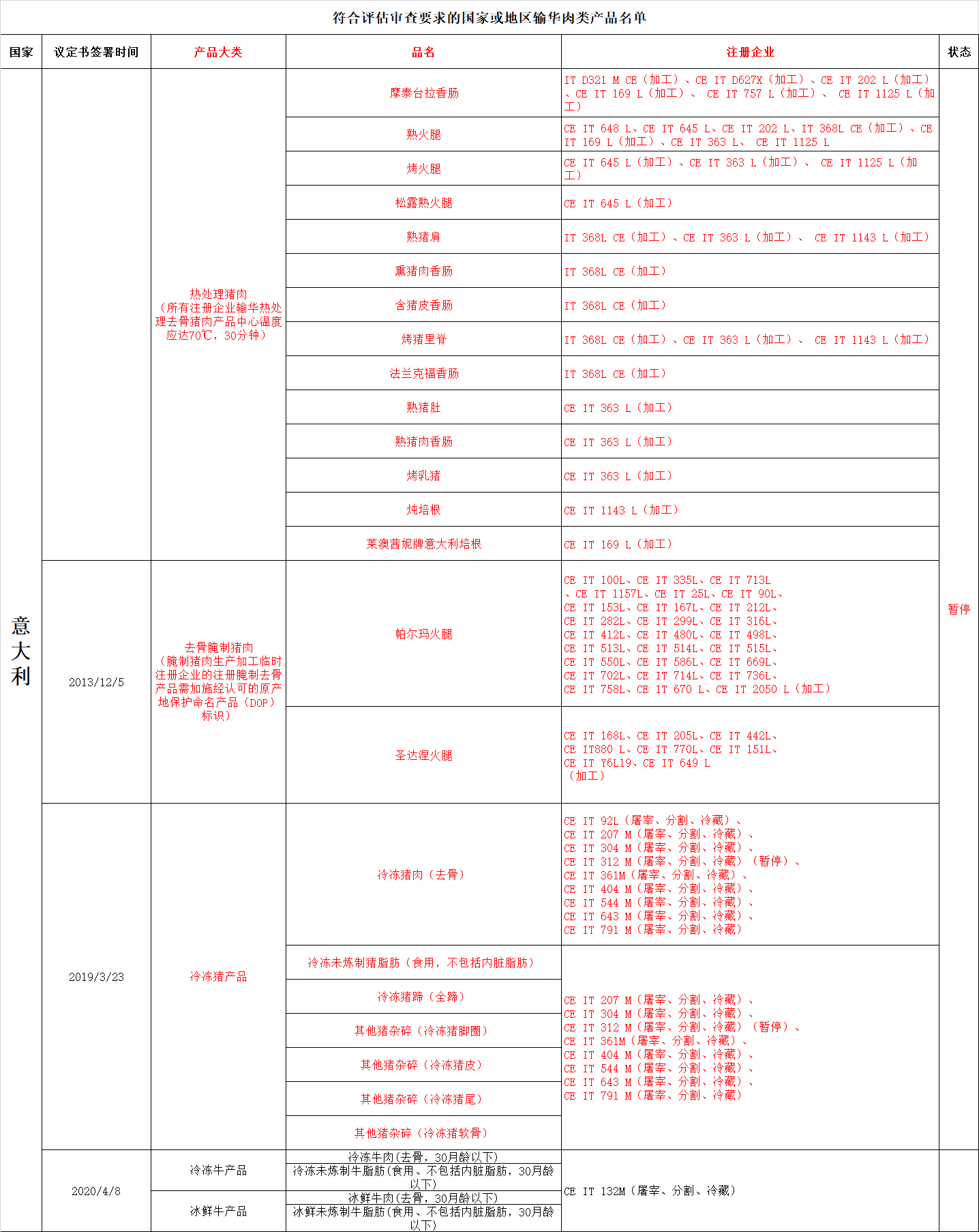 意大利自2022年1月7日(含)起自主暂停签发输华猪肉及猪肉制品卫生证书。