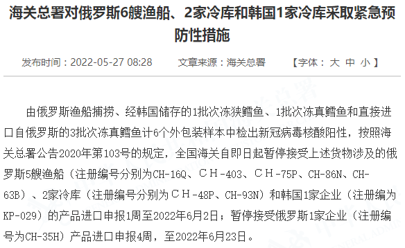 由俄罗斯渔船捕捞、经韩国储存的1批次冻狭鳕鱼、1批次冻真鳕鱼和直接进口自俄罗斯的3批次冻真鳕鱼计6个外包装样本中检出新冠病毒核酸阳性,按照海关总署公告2020年第103号的规定,全国海关自即日起暂停接受上述货物涉及的俄罗斯5艘渔船(注册编号分别为CH-16Q、СН-403、СН-75P、CH-86N、CH-63B)、2家冷库(注册编号分别为СН-48P、CH-93N)和韩国1家企业(注册编为KP-029)的产品进口申报1周至2022年6月2日;暂停接受俄罗斯1家企业(注册编号为CH-35H)产品进口申报4周,至2022年6月23日。
