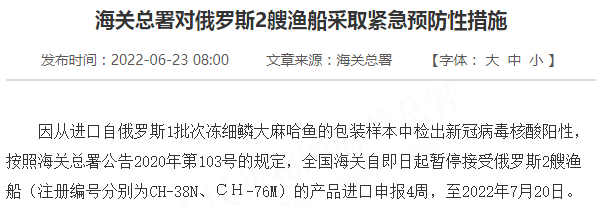 因从进口自俄罗斯1批次冻细鳞大麻哈鱼的包装样本中检出新冠病毒核酸阳性,按照海关总署公告2020年第103号的规定,全国海关自即日起暂停接受俄罗斯2艘渔船(注册编号分别为CH-38N、СН-76M)的产品进口申报4周,至2022年7月20日。
