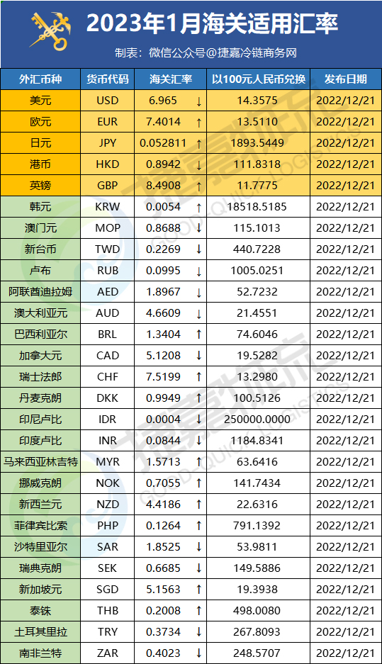 根据《中华人民共和国海关进出口货物征税管理办法》(海关总署令2005年第124号)第十六条的规定,海关每月使用的计征汇率为上一个月第三个星期三(第三个星期三为法定节假日的,顺延采用第四个星期三)中国人民银行公布的外币对人民币的基准汇率;
