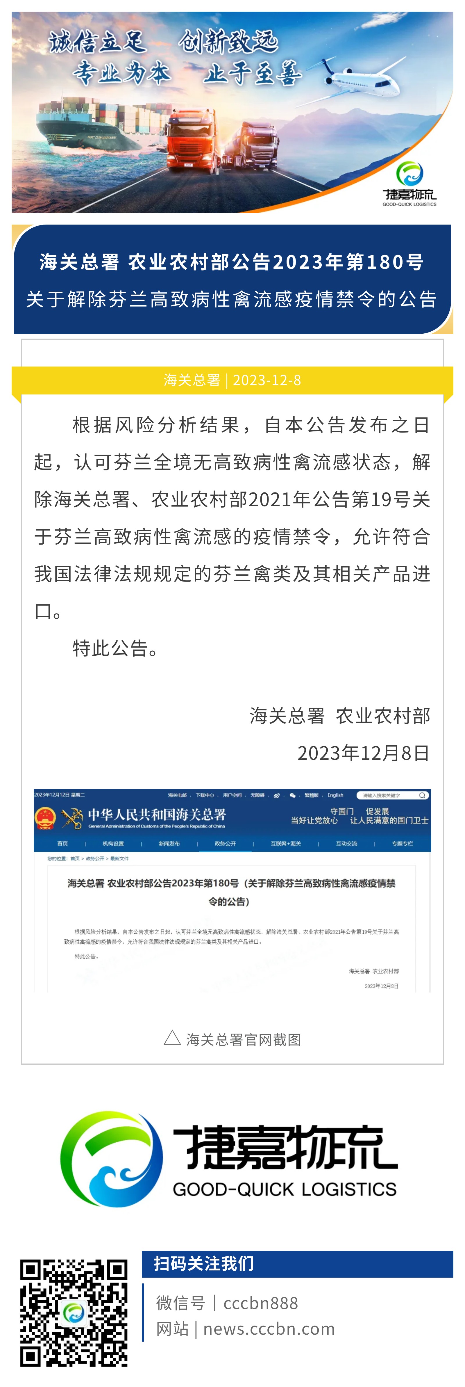 捷嘉 · 快讯 | 海关总署 农业农村部:关于解除芬兰高致病性禽流感疫情禁令的公告