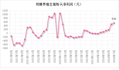 7、2024年7月份规模养殖生猪每头净利润538元;