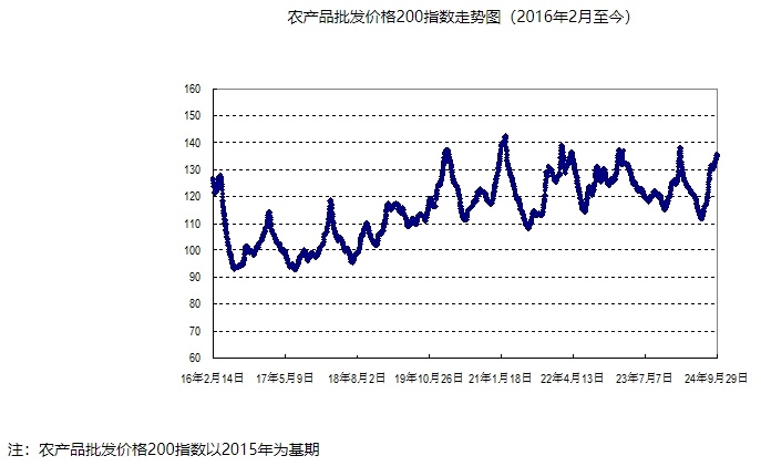 据农业农村部监测,2024年第39周(2024年9月23日—29日,下同)“农产品批发价格200指数”为134.82(以2015年为100),比前一周升1.16个点,同比高14.10个点;“‘菜篮子’产品批发价格指数”为138.21(以2015年为100),比前一周升1.34个点,同比高17.43个点。