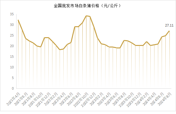 4、2024年8月份全国批发市场白条猪价格27.11元/公斤,环比上涨9.4%,同比上涨 20.2%。