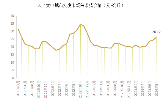 5、2024年8月份36个大中城市批发市场白条猪价格26.12元/公斤,环比上涨7.8%,同比上涨16.8%。
