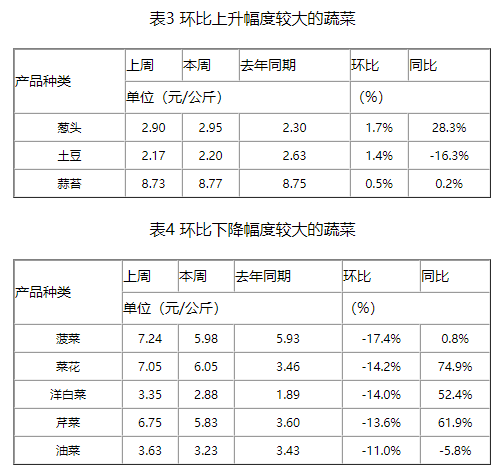 监测的19种蔬菜价格中,本周葱头、土豆和蒜苔的价格环比涨幅较大,幅度分别为1.7%、1.4%和0.5%(如表3所示);菠菜、菜花、洋白菜、芹菜和油菜的价格环比降幅较大,幅度为17.4%、14.2%、14.0%、13.6%和11.0%(如表4所示)。