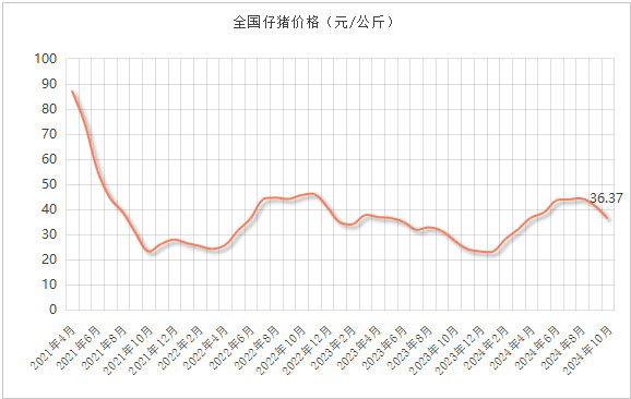 2、2024年10月份全国仔猪价格 36.37元/公斤,环比下跌12.3%,同比上涨32.1%。