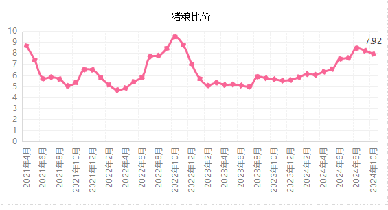 1、2024年10月份猪粮比价7.92,环比下降3.6%,同比增长40.4%;