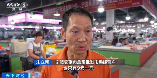 宁波农副肉禽蛋批发市场经营户 朱立新:价格跟上个月相比,下降10%左右,现在前腿肉价格是9元/斤,仔排是17元/斤,里脊肉是17元/斤,五花肉是12元/斤。