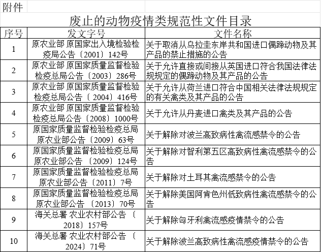根据工作实际,海关总署、农业农村部决定废止部分动物疫情类规范性文件,具体文件目录见附件。本公告自发布之日起生效。