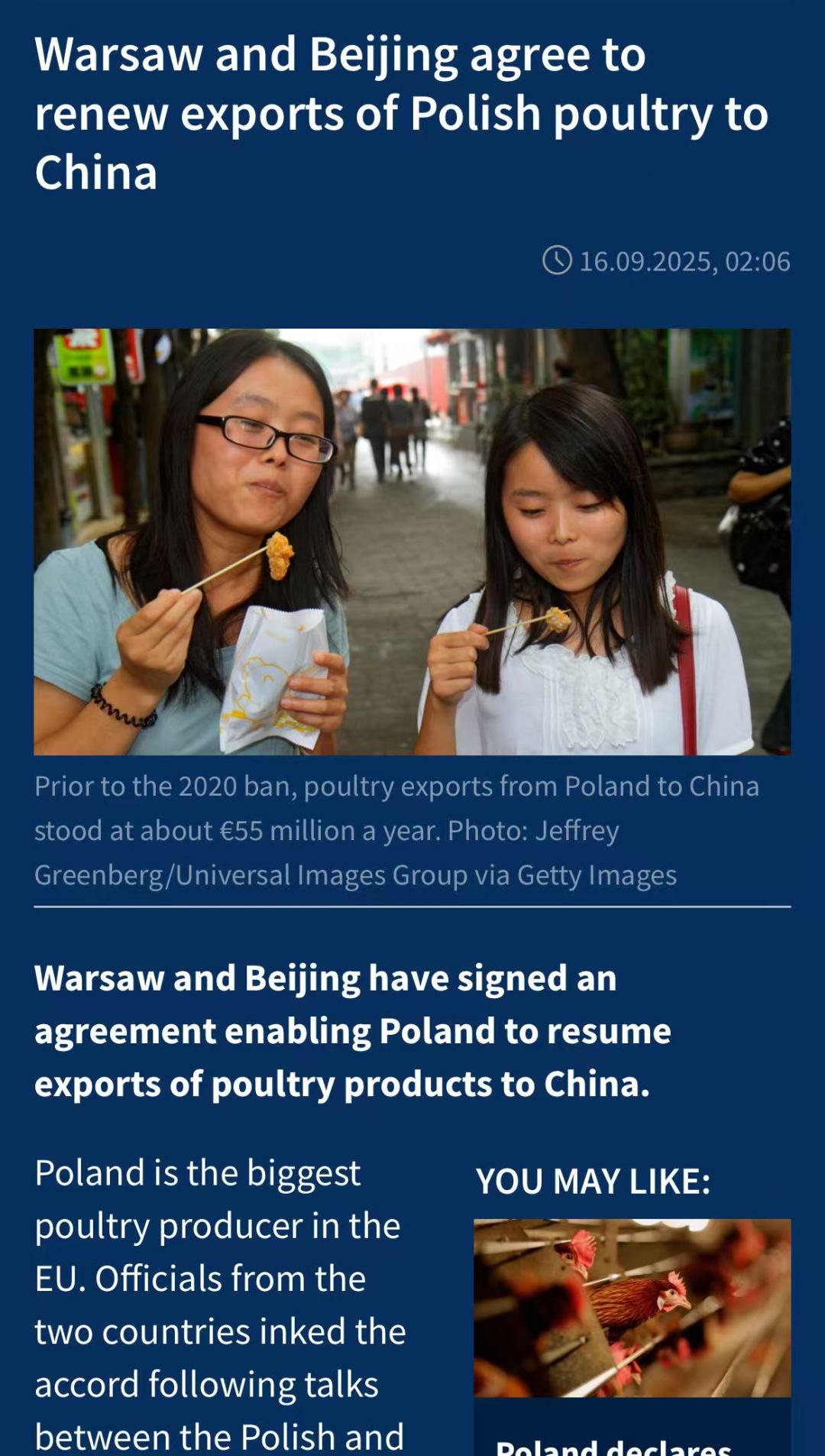 波兰是欧盟最大的家禽生产国。在2020年禁令生效前,其对华禽类年出口额高达约5500万欧元。此次协议的达成被视为两国农业食品领域合作的重大突破,预计出口将在一个月左右全面恢复。