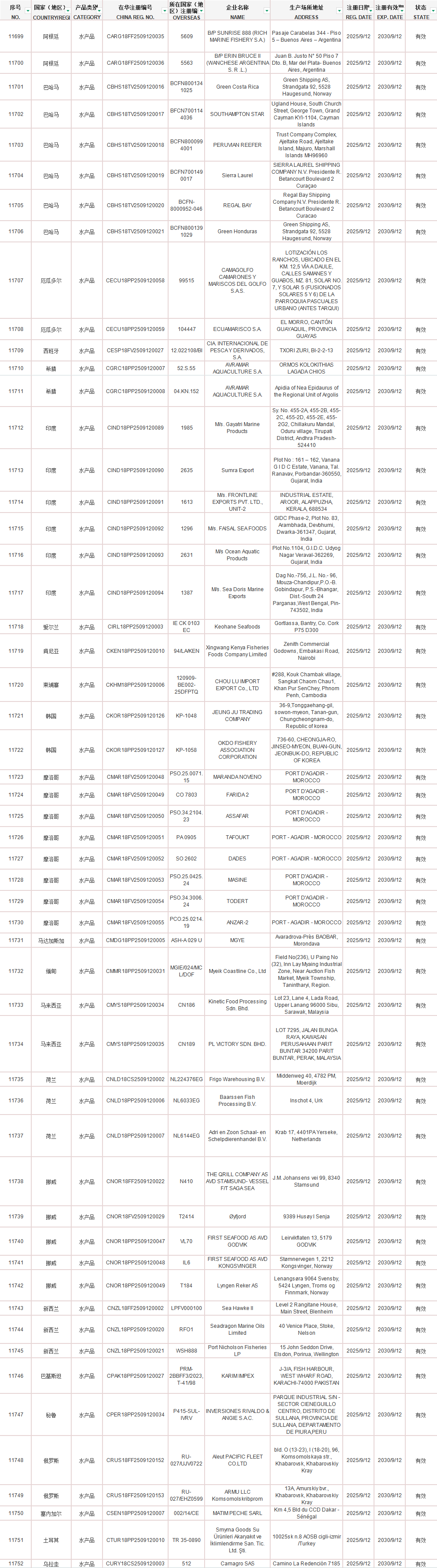 11.海关总署新增摩洛哥8家水产品企业输华注册(注册编码为:PSO.25.0071.15、CO 7803、PSO.34.2104.23、PA 0905、SO 2602、PSO.25.0425.24、PSO.34.3006.24、PCO.25.0214.19)自2025年9月12日及之后生产的符合中国要求的水产品允许输华。