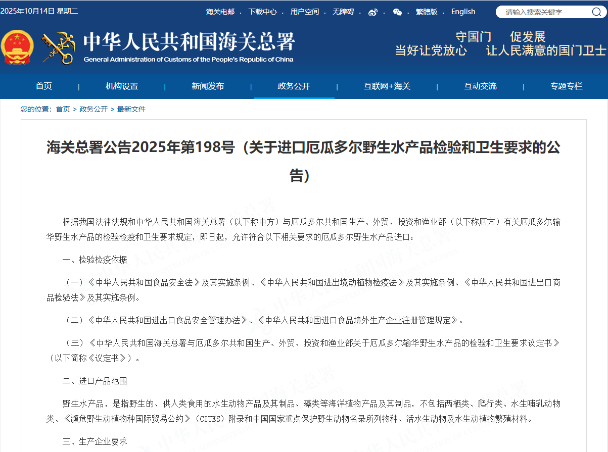 根据我国法律法规和中华人民共和国海关总署(以下称中方)与厄瓜多尔共和国生产、外贸、投资和渔业部(以下称厄方)有关厄瓜多尔输华野生水产品的检验检疫和卫生要求规定,即日起,允许符合以下相关要求的厄瓜多尔野生水产品进口: