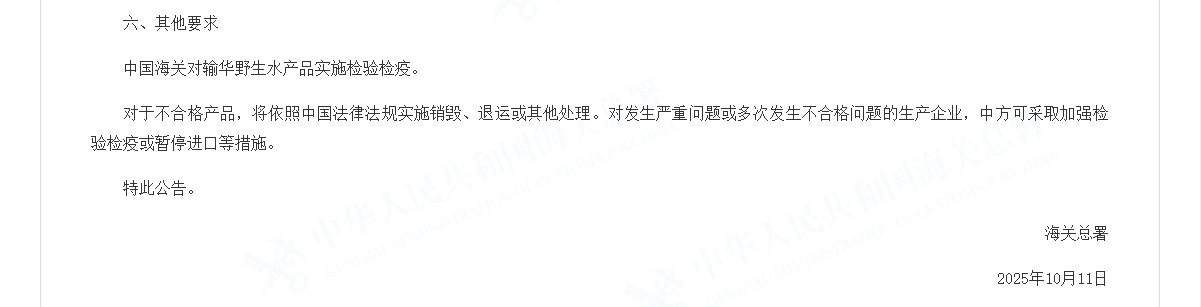 3.厄瓜多尔境内发生重大食品安全事件,或生产企业发生重大公共卫生事件,或捕捞水域受到污染物影响,已经严重影响输华野生水产品安全。