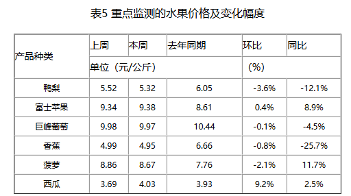 本周重点监测的6种水果平均价格为7.05元/公斤,比上周下降0.1%,同比下降2.6%(如表5所示)。