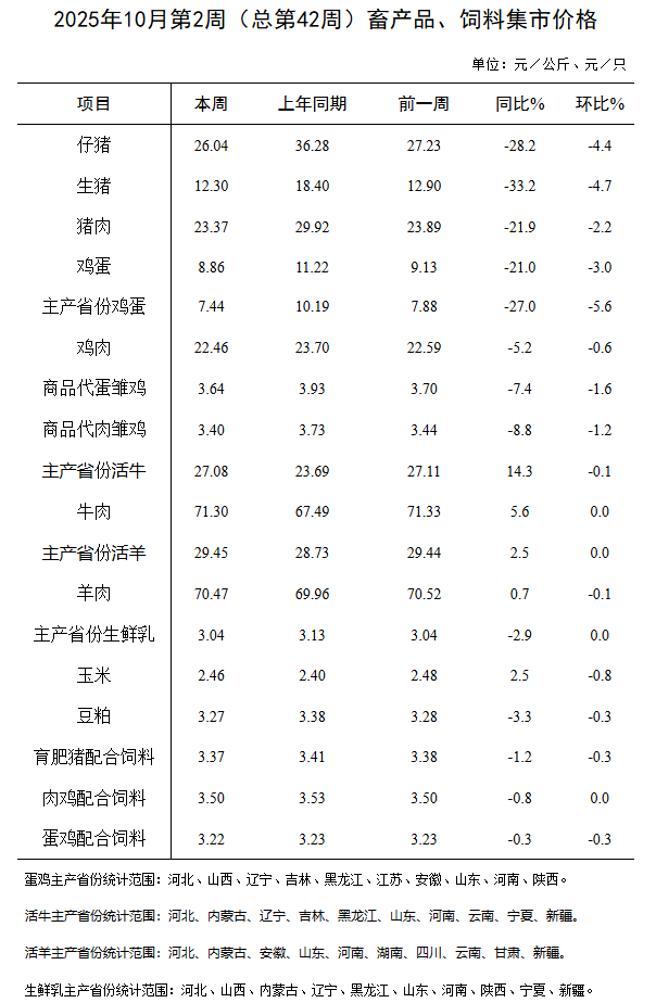 据对全国500个县集贸市场和采集点的监测,10月第2周(采集日为10月16日)生猪产品、鸡蛋、鸡肉、商品代雏鸡、活牛、羊肉、玉米、豆粕、育肥猪配合饲料、蛋鸡配合饲料价格环比下跌,牛肉、活羊、生鲜乳、肉鸡配合饲料价格环比持平。