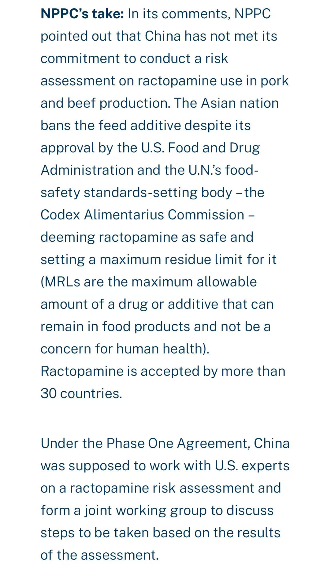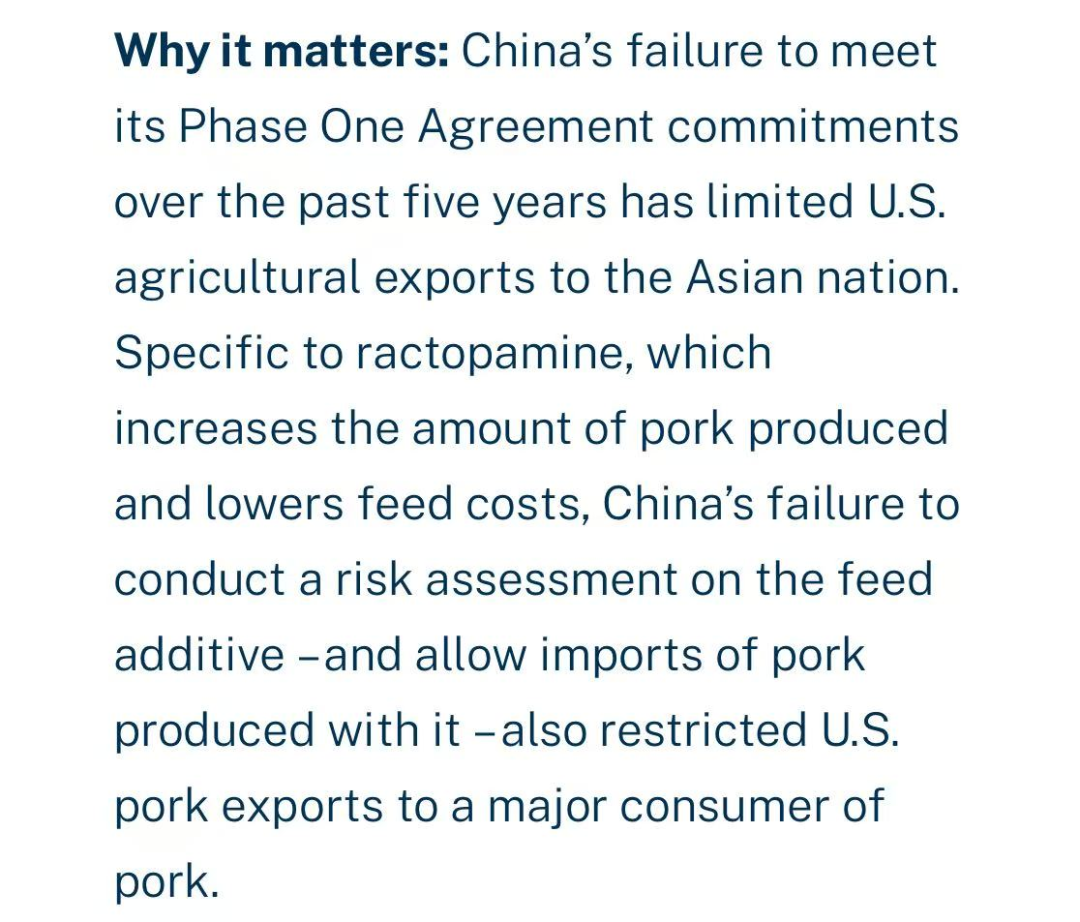 美方指出,中国既未按2020年协议约定对猪肉、牛肉生产中使用莱克多巴胺(ractopamine)开展风险评估,也持续禁止含该添加剂的肉类产品进口。该添加剂已获美国FDA批准,并被联合国食品法典委员会(Codex)设定最大残留限量(MRL),目前全球逾30国允许使用。