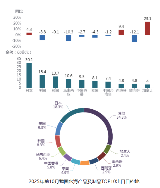 市场方面,前10个月,我国水海产品及制品出口额排名前十的国家/地区分别为日本、美国、韩国、马来西亚、中国香港、泰国、中国台湾省、西班牙、墨西哥、加拿大,合计占我国该产品出口额的65.7%。