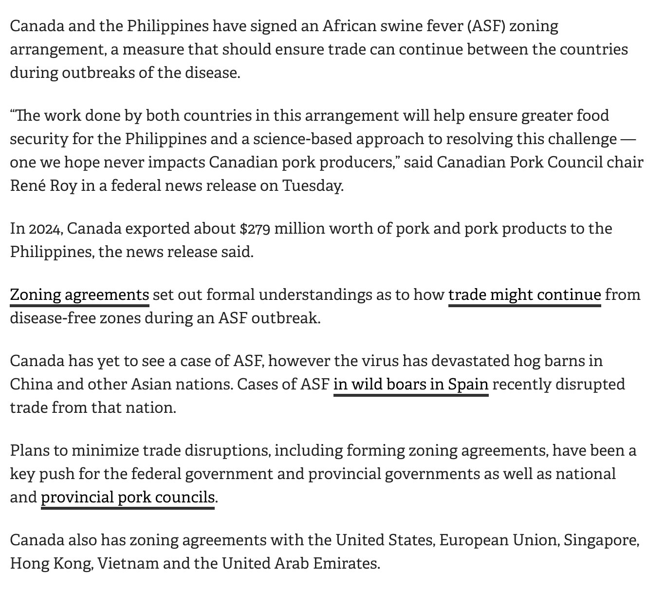 加拿大与菲律宾签署了非洲猪瘟(ASF)区域划分协议,旨在确保疫情暴发期间两国贸易可持续进行。