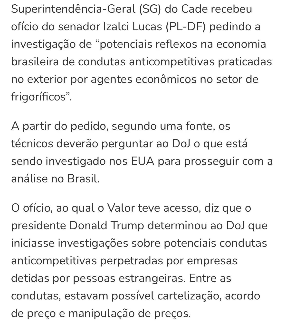 巴西反垄断机构CADE正考虑介入美国对肉类加工行业涉嫌垄断行为的调查。此前,巴西参议员致函CADE,指出美国总统特朗普已要求美国司法部调查外资控股企业可能存在的串谋定价行为,并特别提到巴西企业JBS与美国第四大肉类企业National Beef(由巴西Marfrig控股)在市场中的主导地位。