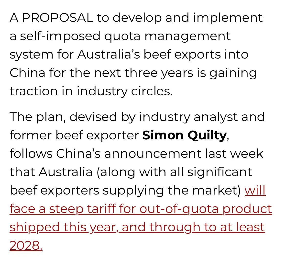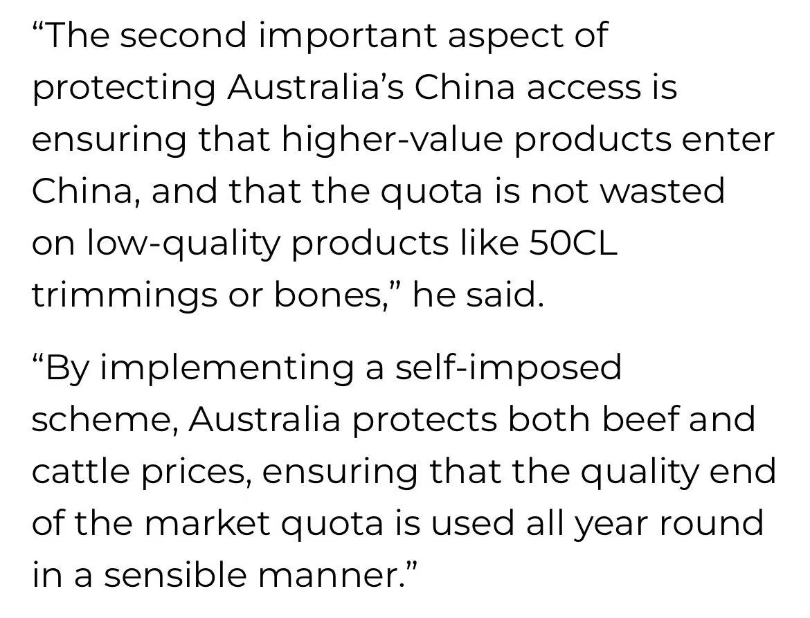 为此,行业分析师Quilty建议在政府监督下由行业自主分配配额,按企业过往出口记录确定额度,并允许配额流转。该方案旨在引导有限配额用于高附加值产品,避免被低价值品类占用,从而稳定澳大利亚牛肉价格与养殖户收益。