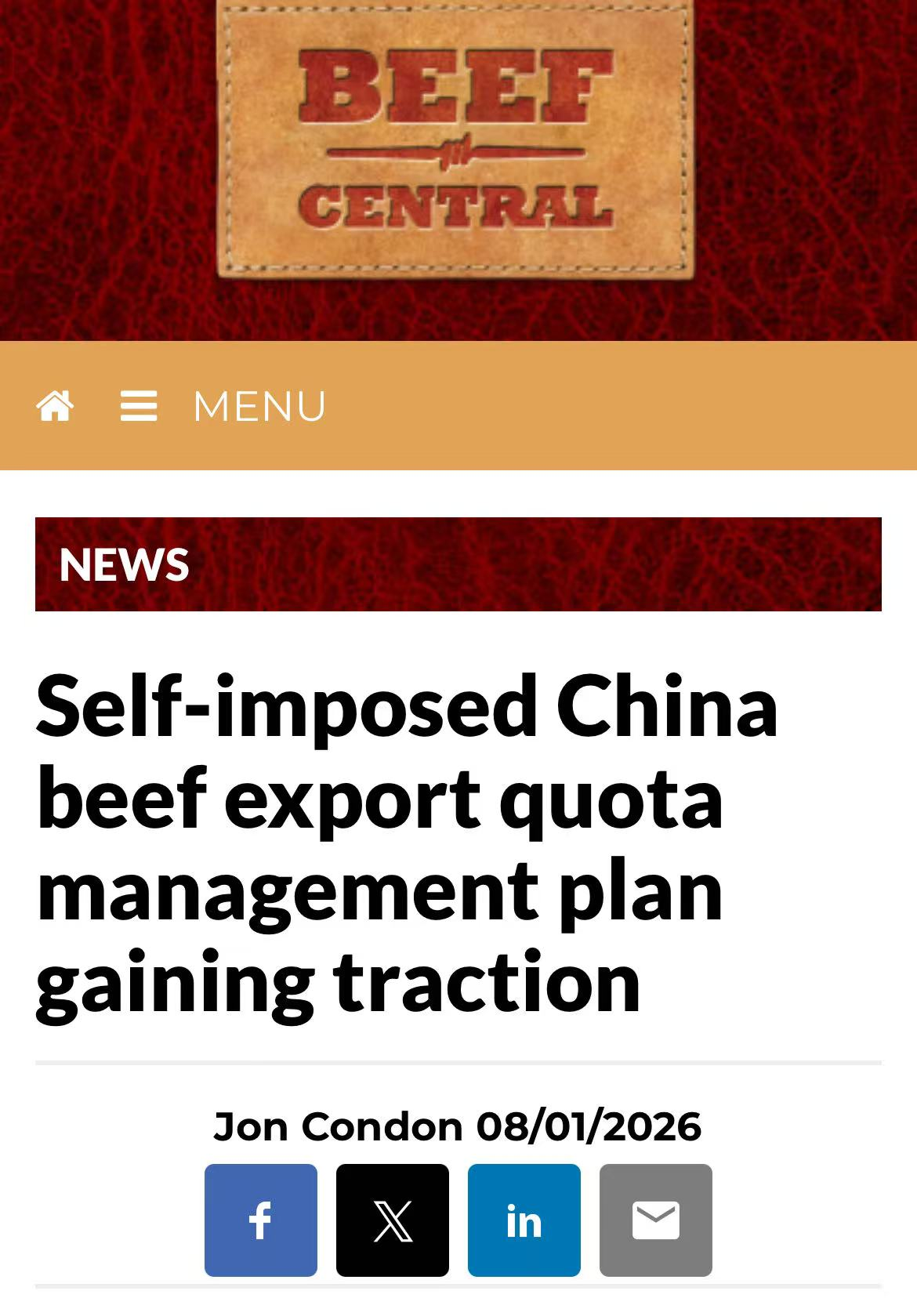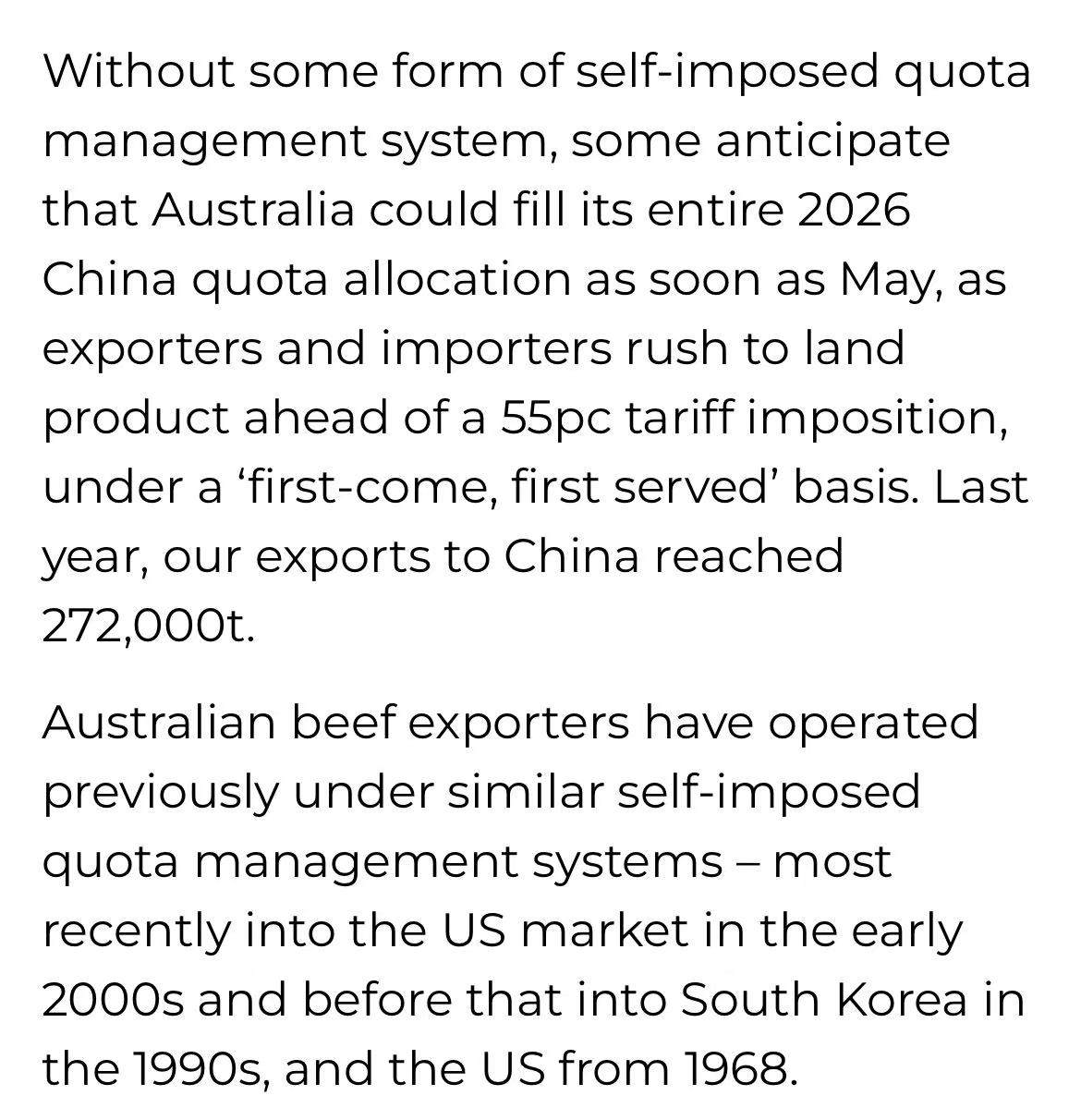澳大利亚牛肉行业正积极推动建立一套对华出口“自主管理配额”机制,以应对中国实施的进口保障措施。根据中国新规,澳大利亚2026年对华牛肉出口配额为20.5万吨,超额部分将面临55%的高关税,这实质上可能阻断超出配额部分的贸易。