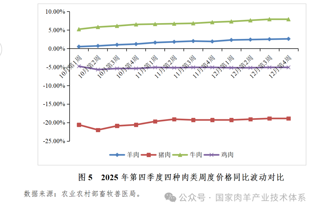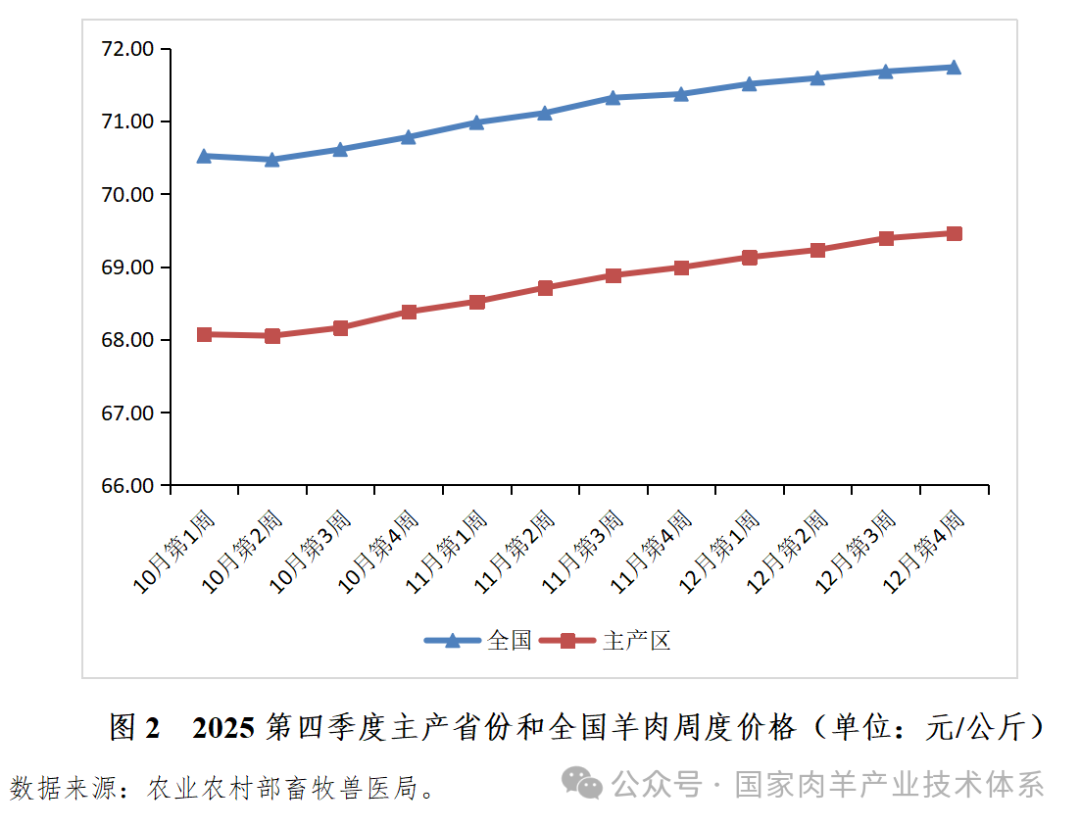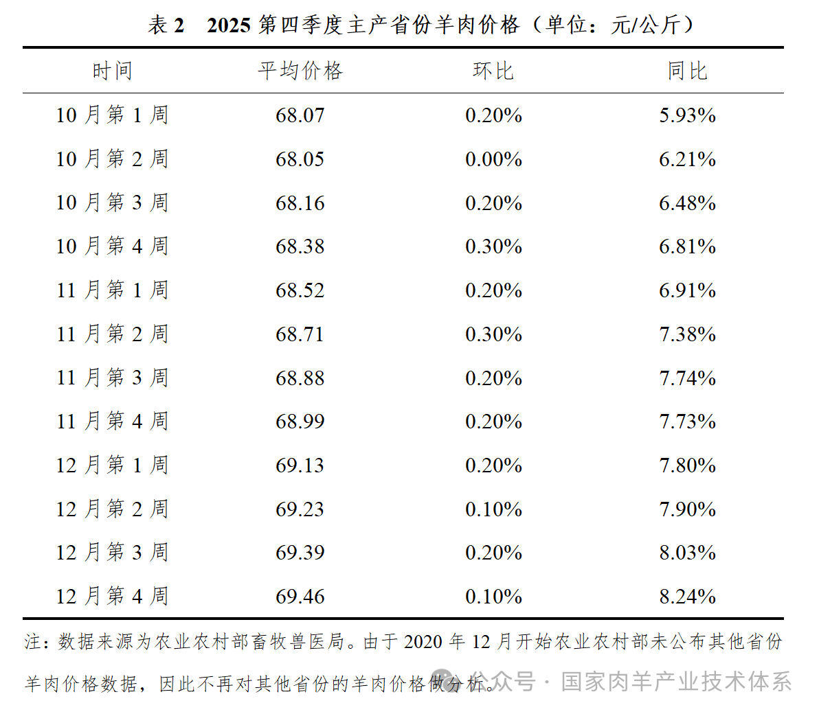 第四季度,主产省份羊肉价格整体呈现连续稳步上行趋势。价格由10月第1周的68.07元/公斤持续上涨至12月第4周的69.46元/公斤。季度内各周价格环比均为正增长,平均环比增长约0.18%;同比增幅显著且逐周扩大,平均同比增长约7.26%,反映出主产省份价格恢复势头强劲。