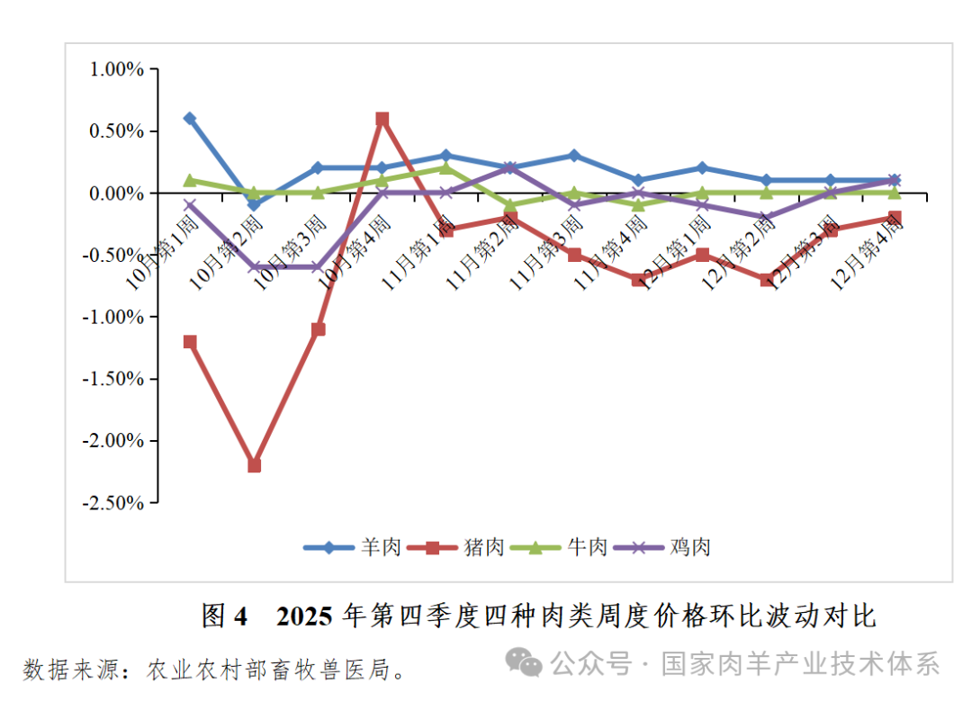 三是相比于其他肉类市场,羊肉是本季度唯一实现价格连续上涨的品种。在牛肉价格走稳、猪肉与鸡肉价格下行的背景下,羊肉市场受供需关系改善、季节性消费提振及养殖成本支撑等多重因素推动,价格进入温和上涨通道。预计下一季度,在节假日消费持续拉动下,羊肉价格有望延续稳中有升趋势,但受市场整体供应能力、进口补充及肉类间竞争格局影响,价格上行空间预计保持平稳。