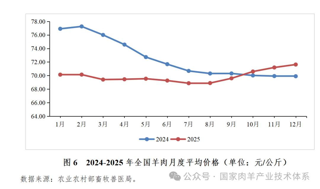 2025年全国羊肉价格呈现出1-2月相对平稳,3-8月波动下行,9-12月稳步回升的走势,整体价格从1月的70.14元/公斤温和上涨至12月的71.63元/公斤。与2024年同期相比,2025年上半年羊肉价格持续低于去年水平;进入下半年,尤其是第四季度,羊肉价格回升势头明显,并于10月起反超去年同期,反映出市场供需格局逐步改善、价格进入恢复通道。全年来看,羊肉价格季节性波动特征依然显著,整体走势呈现“先抑后扬”态势(图6)。