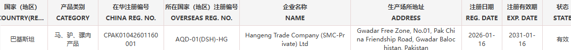 1.新增巴基斯坦1家注册编号为AQD-01(DSH)-HG 马、驴、骡肉产品企业自2026年1月16日(含)后生产的输华产品进口准入。