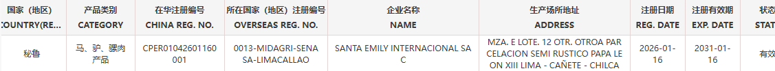 2.新增秘鲁1家注册编号为0013-MIDAGRI-SENASA-LIMACALLAO 马、驴、骡肉产品企业自2026年1月16日(含)后生产的输华产品进口准入。