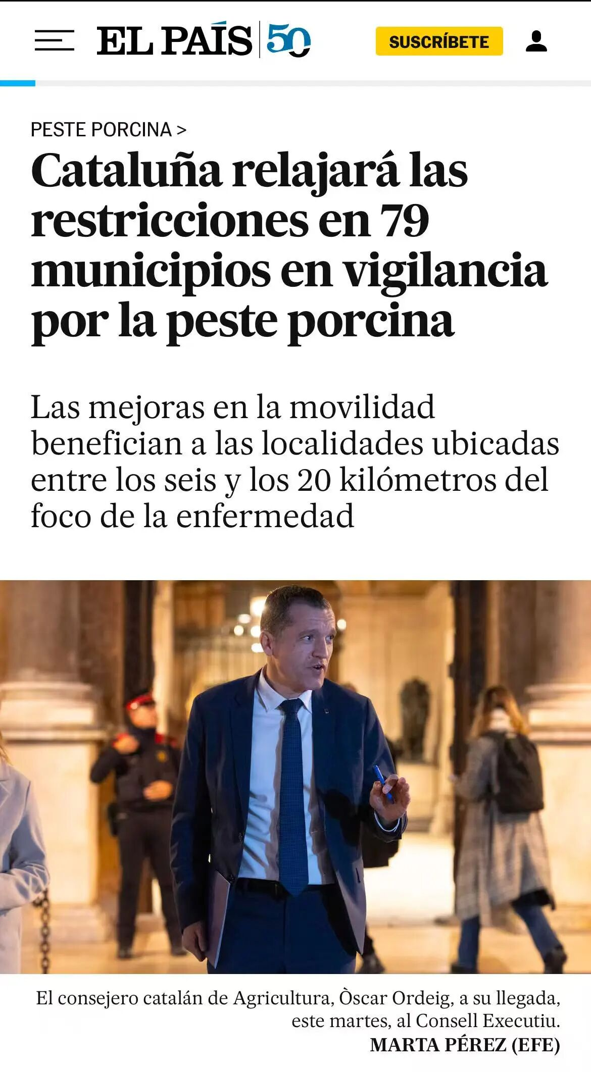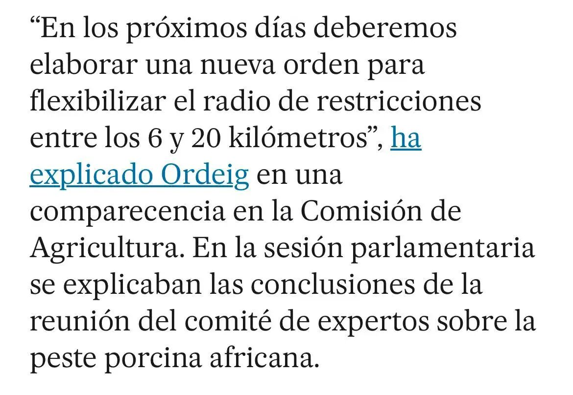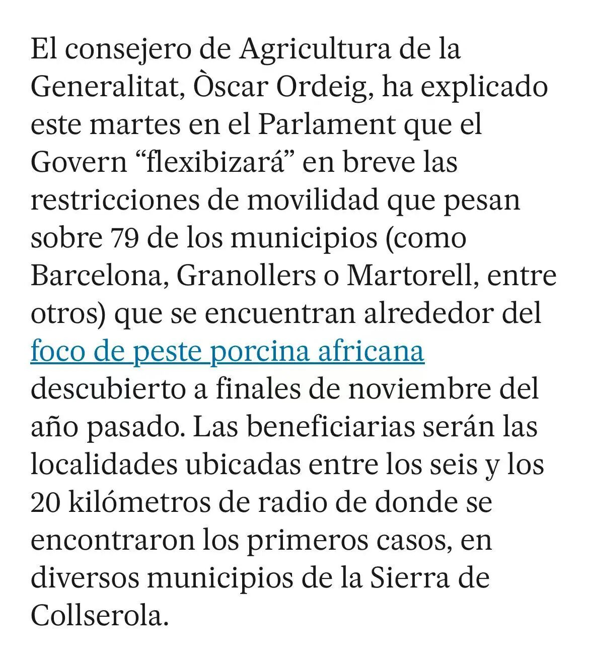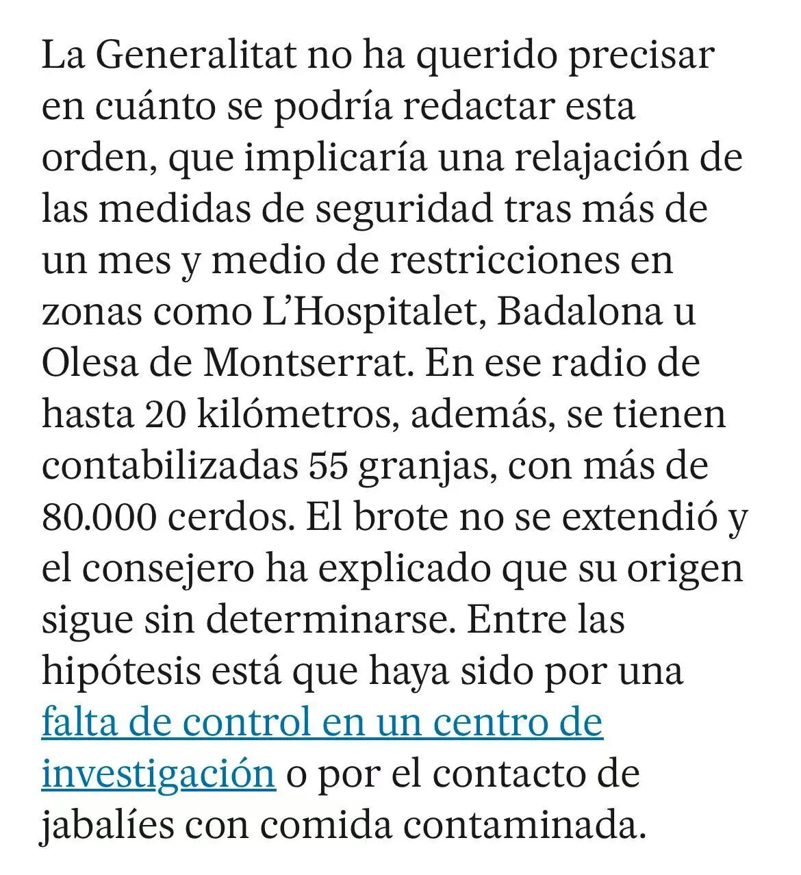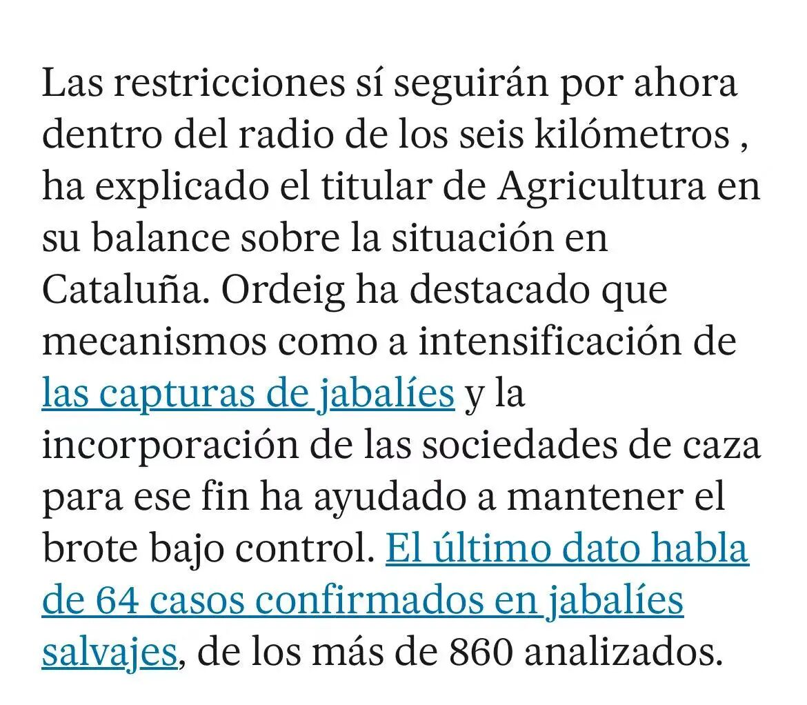 为控制疫情,当地实施了分级管控。农业部长Òscar Ordeig宣布,将于近期出台政令,放宽对疫点周边6至20公里范围内79个市镇的限制,包括巴塞罗那等主要城镇。但核心区6公里范围内的严格限制措施将继续维持。