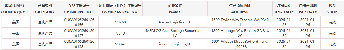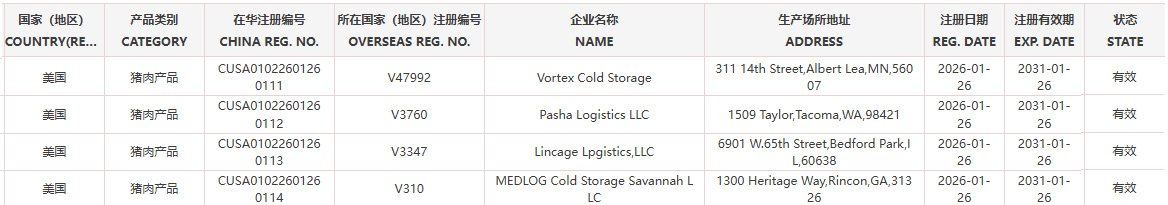 2.新增美国4家注册编号为V310、V3760、V3347、V47992猪肉产品企业自2026年1月26日(含)后生产的输华产品进口准入。