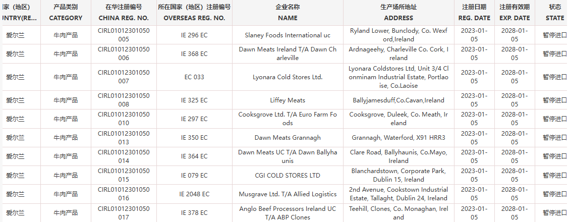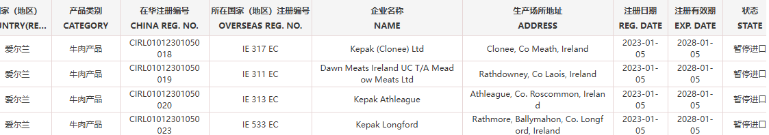 暂停受理爱尔兰23家牛肉企业(注册编码为:IE 300 EC、IE 344 EC、IE 354 EC、IE 512 EC、IE 351 EC、IE 290 EC、IE 2007 EC、IE 382 EC、IE 292 EC、IE 296 EC、IE 368 EC、EC 033、IE 325 EC、IE 297 EC、IE 350 EC、IE 364 EC、IE 079 EC、IE 2048 EC、IE 378 EC、IE 317 EC、IE 311 EC、IE 313 EC、IE 533 EC)自2026年1月27日(含)起启运的输华产品进口申报。