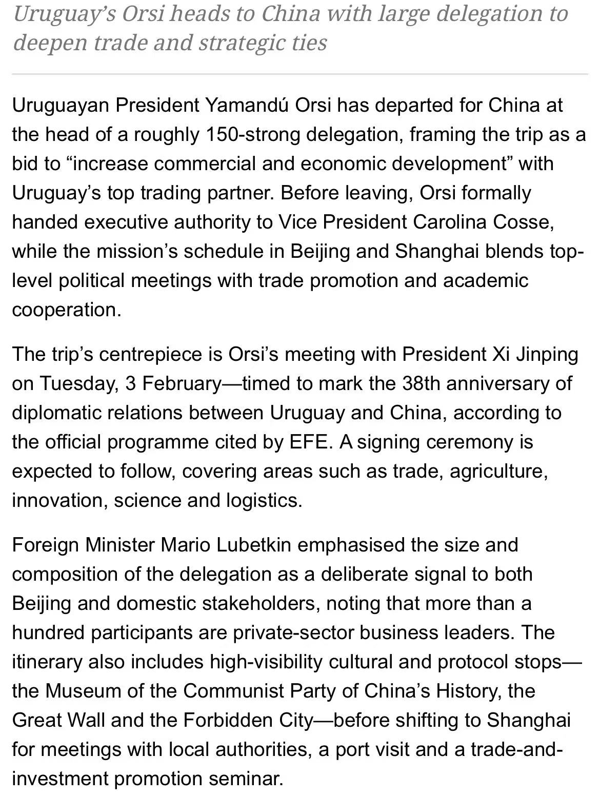乌拉圭总统亚曼杜·奥尔西率约150人大型代表团访华,聚焦深化对华贸易,其中牛肉出口合作成为关键议题。此次访问适逢中乌建交38周年,奥尔西将于2月3日与中国国家主席习近平会晤,并签署多项双边协议。