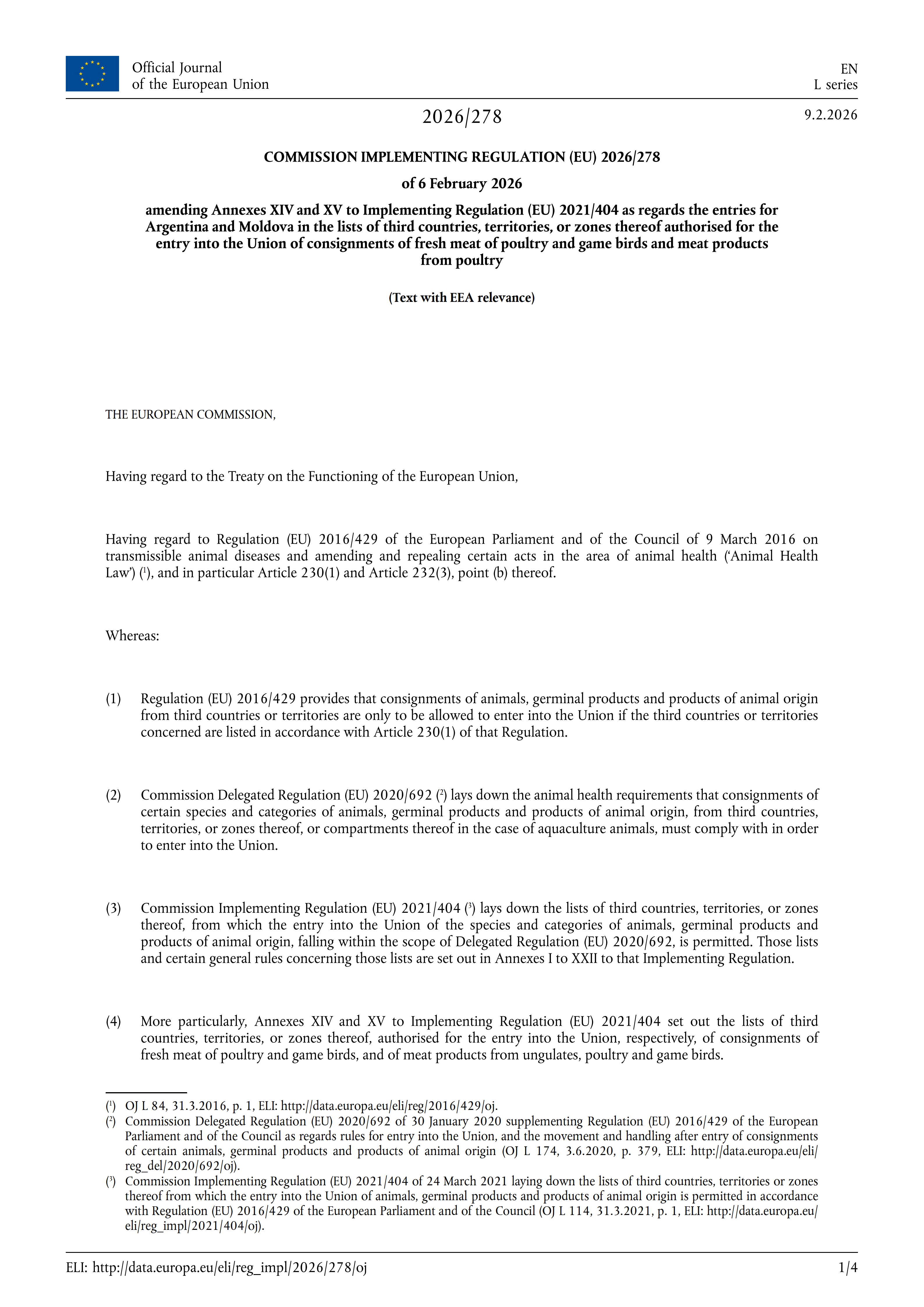 根据欧盟官方2月9日公布的法规(EU) 2026/278,欧盟已正式恢复阿根廷禽肉及其制品的进口资格。新规将于3月1日起生效。