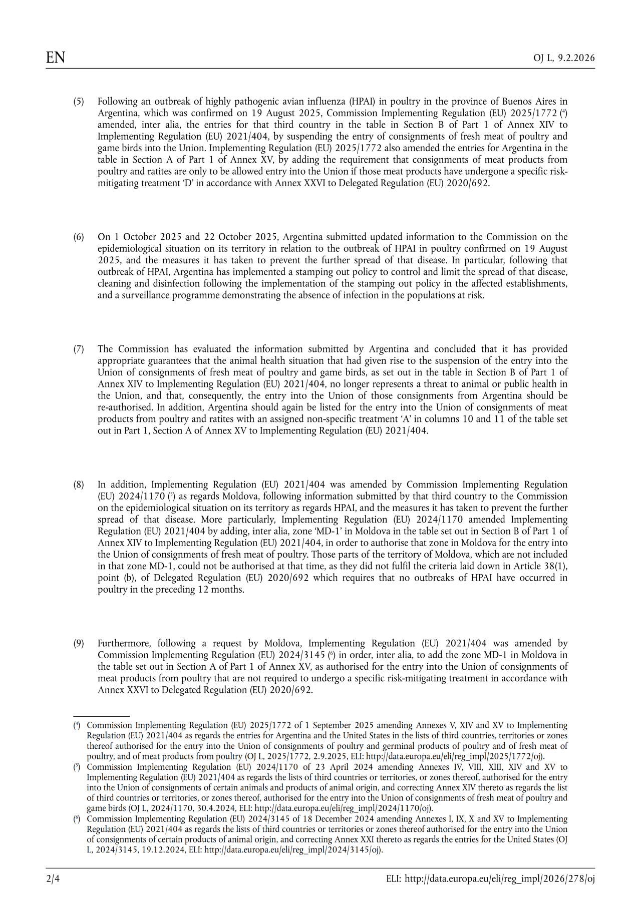 此前,因阿根廷布宜诺斯艾利斯省在2025年8月发生高致病性禽流感,其相关产品被暂停对欧出口。经评估,欧盟委员会认为阿根廷提供的疫情控制与监测信息充分,相关卫生风险已消除,因此决定解除限制。