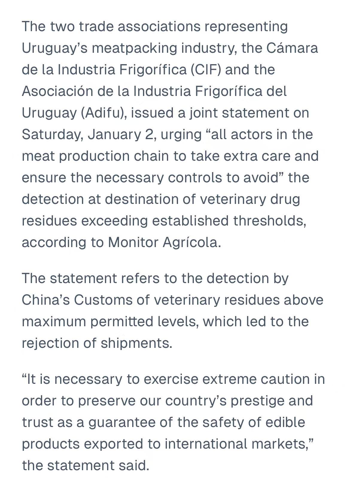 此次联合声明源于中国海关在部分乌拉圭输华牛肉中检出兽药残留超标,相关批次已被退回。行业警告,若不立即加强监管,可能影响乌拉圭牛肉现有的国际市场准入,并损害其长期建立的食品安全信誉。