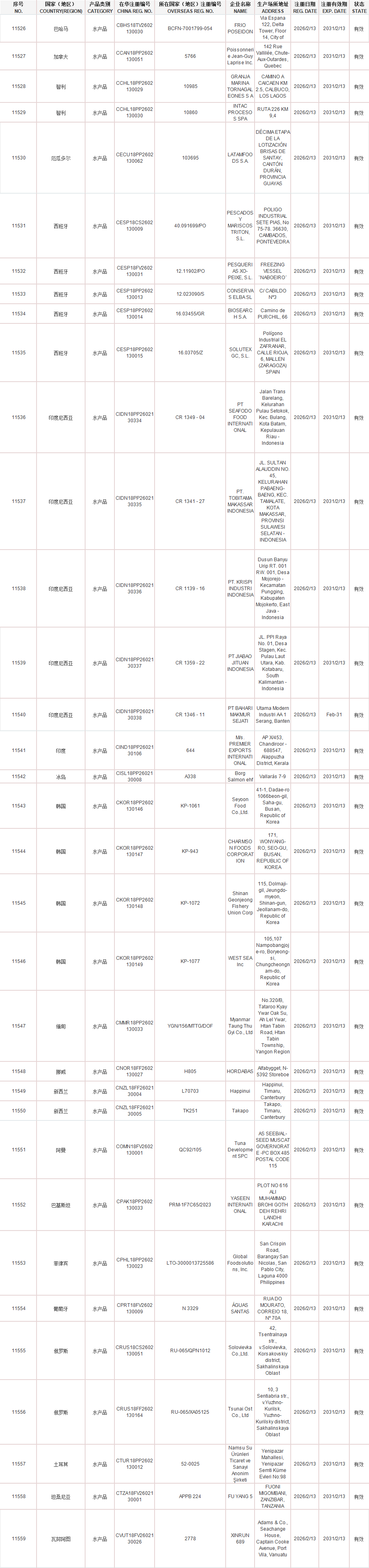 6.海关总署新增印度尼西亚5家水产品企业输华注册(注册编码为:CR 1349 - 04、CR 1341 - 27、CR 1139 - 16、CR 1359 - 22、CR 1346 - 11)自2026年2月13日(含)后生产的输华产品进口准入。