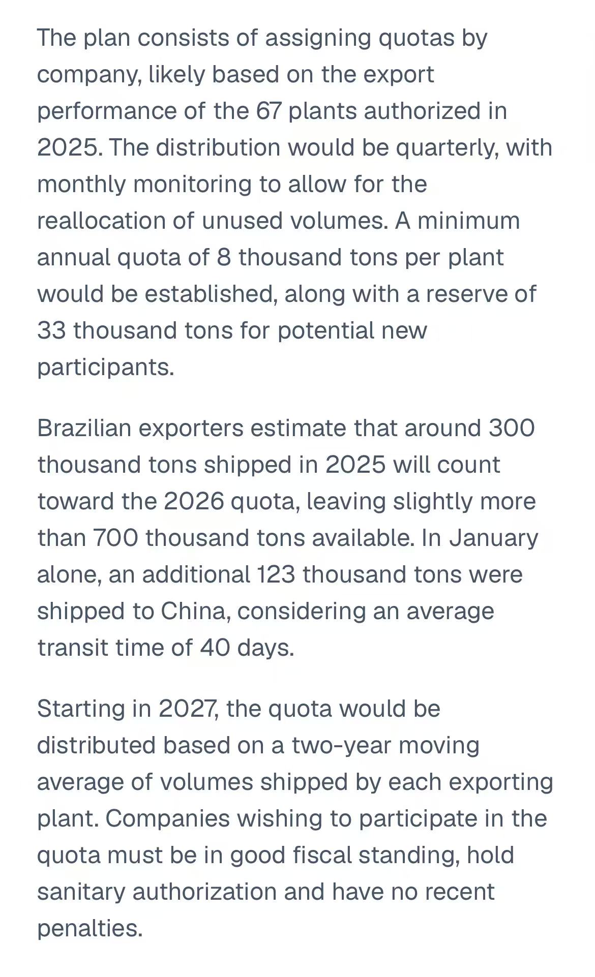 具体而言,110.6万吨配额将按2025年67家获准对华出口工厂的实际市场份额,在前三季度内分季度发放,并实施月度监测调剂机制——若出口商未使用当季配额,余额将在其他企业间重新分配。为兼顾中小企业和新进入者,方案设定了每家每年8000吨的“保底”份额,并预留了3.3万吨的机动额度。