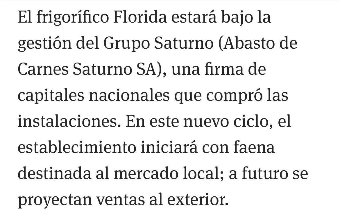 该厂自2024年12月初全面停产,2024年全年屠宰12540头牛,约占乌拉圭全国屠宰量的0.56%。此次复产由本土企业Grupo Saturno接手运营,初期将提供约100个就业岗位,主要面向国内市场屠宰,后续计划重启出口。