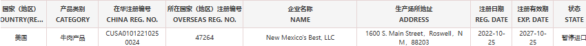 暂停受理美国1家牛肉企业(注册编码为:47264)自2026年3月20日(含)起启运的输华产品进口申报。