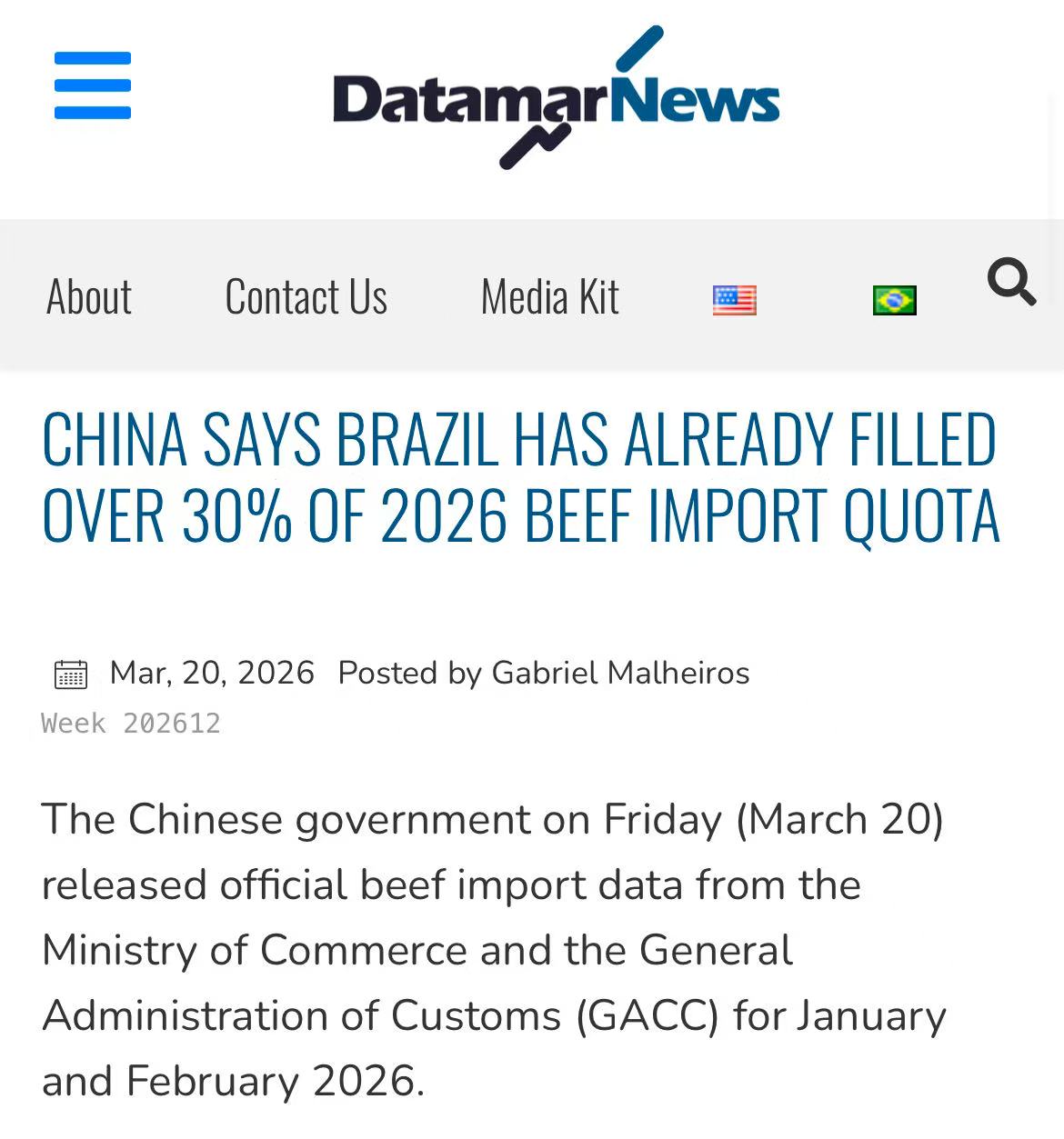 据中国海关3月20日公布的数据,2026年1-2月,中国自巴西进口牛肉37.2万吨,占全年110.6万吨配额的33.6%。其中1月21.1万吨,2月16.1万吨。这一数据由巴西肉类出口工业协会(ABIEC)整理发布。
