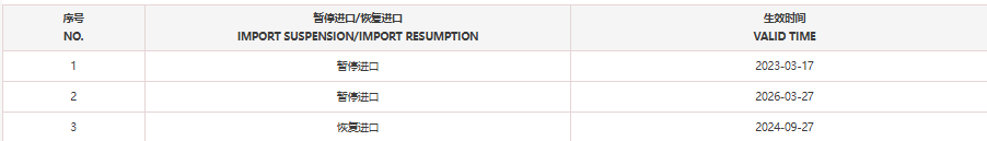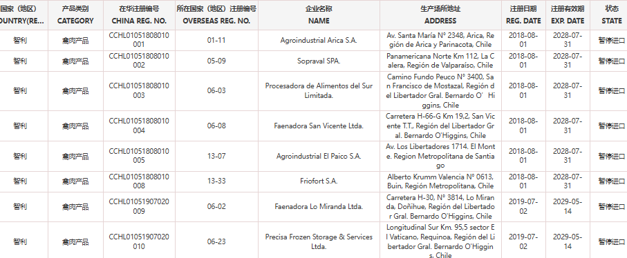 暂停受理智利8家禽肉企业(注册编码为:01-11、05-09、06-03、06-08、13-07、13-33、06-02、06-23)自2026年3月27日(含)起启运的输华产品进口申报。