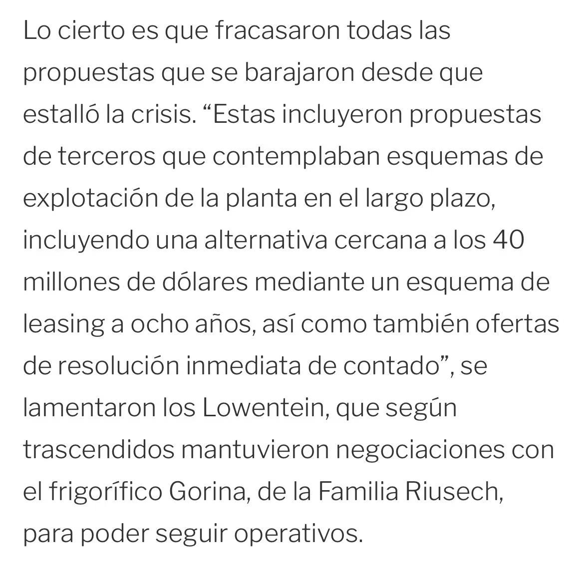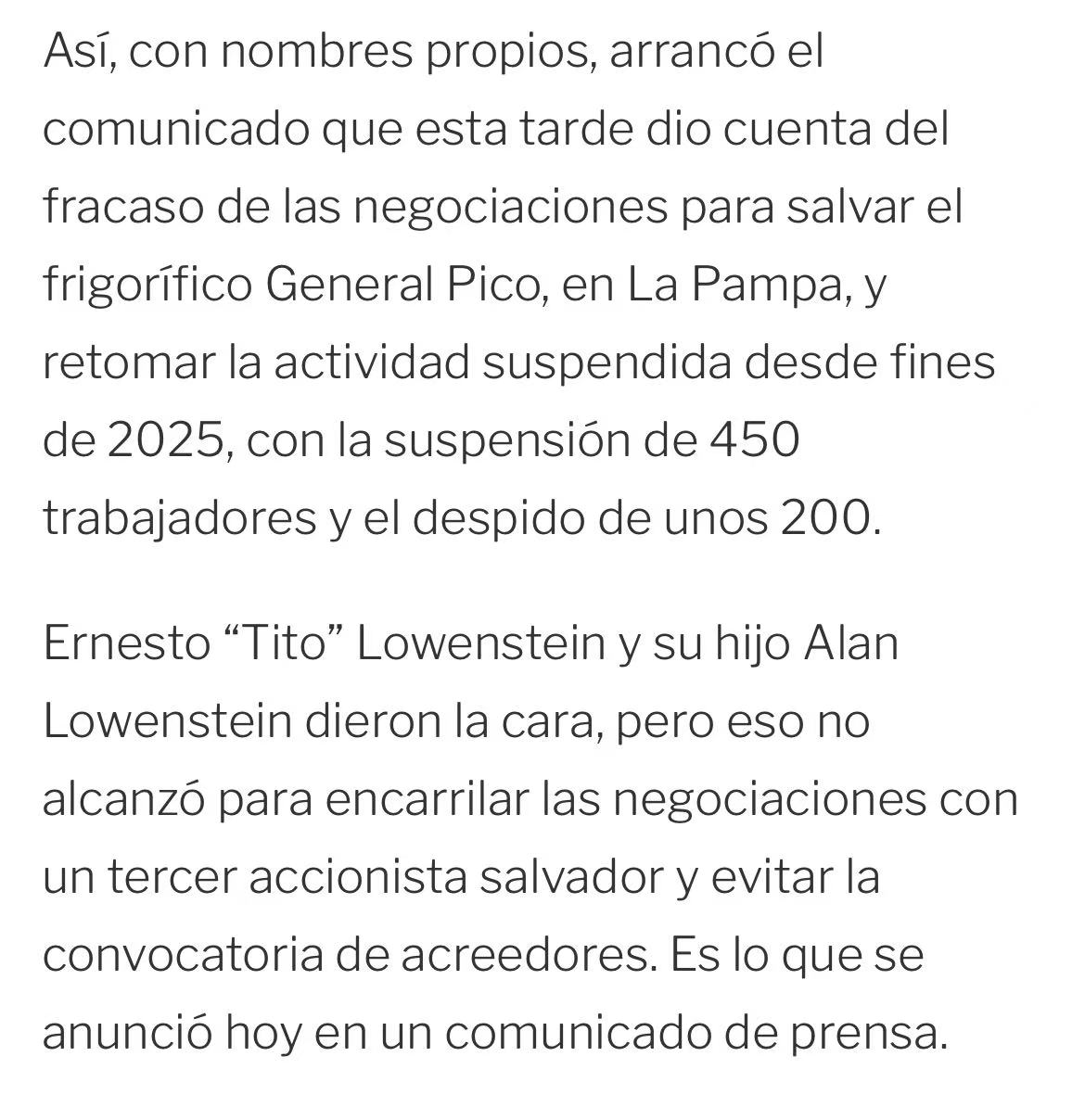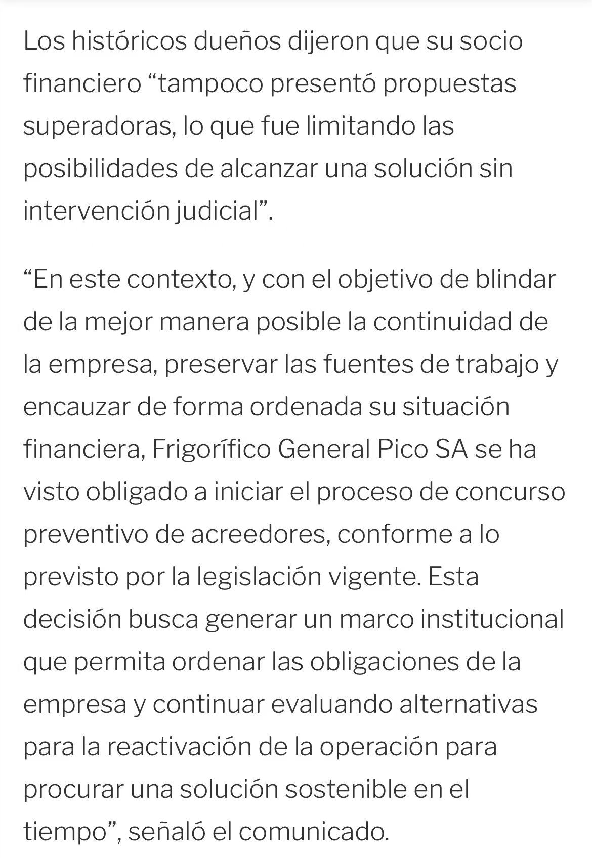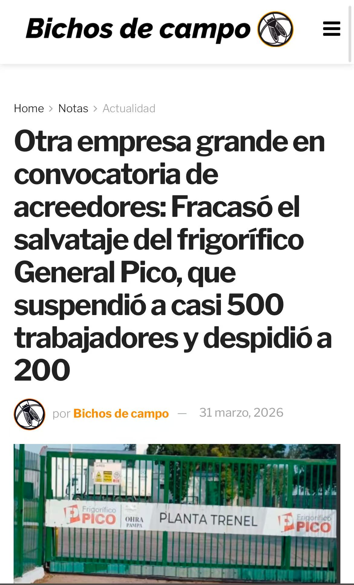 阿根廷拉潘帕省General Pico屠宰厂(2531/2792厂)的救助谈判宣告失败,企业被迫启动债权人重整程序。